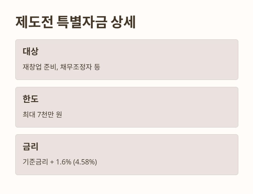 | 제도전 특별자금 | 재창업 준비, 채무조정자 등 | 최대 7천만 원 | 기준금리 + 1.6% | 동일 |