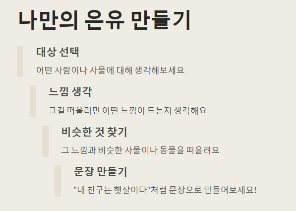 이제 직접 은유법을 만들어볼 시간이에요! 아래 단계들을 따라 하면, 누구나 쉽게 자신만의 은유를 만들 수 있답니다.