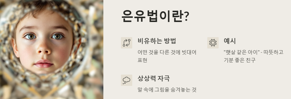 은유법이란 아주 간단히 말하면, 어떤 것을 다른 것에 빗대어 말하는 방법이에요. 예를 들어, 친구를 “햇살 같은 아이”라고 부르면, 진짜로 햇빛이라는 뜻은 아니지만, 그 친구가 따뜻하고 기분 좋다는 걸 표현한 거죠. 이렇게 다른 것에 비유해서 말하는 게 바로 은유법이에요. 마치 말 속에 그림을 숨겨놓는 것처럼, 듣는 사람의 상상력을 자극해요!