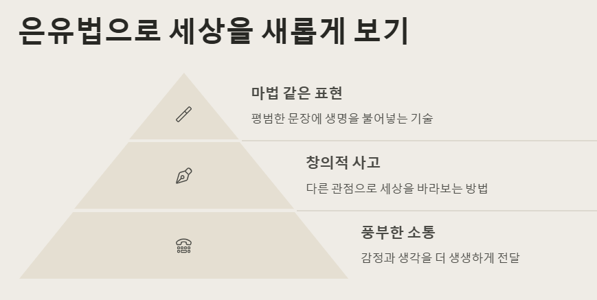 은유법을 쓰면 말이 훨씬 더 풍부하고 재미있어져요. 딱딱한 설명 대신에 감정을 담을 수 있기 때문에 이야기가 훨씬 더 멋져 보이죠. 아래 표에서 그 이유들을 정리해봤어요!