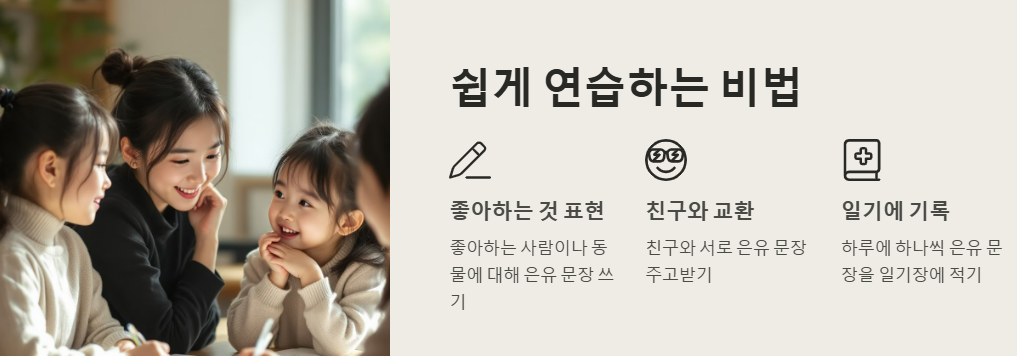 은유법은 자꾸 생각하고 써보는 게 중요해요. 다음은 연습할 수 있는 간단한 방법들이에요!