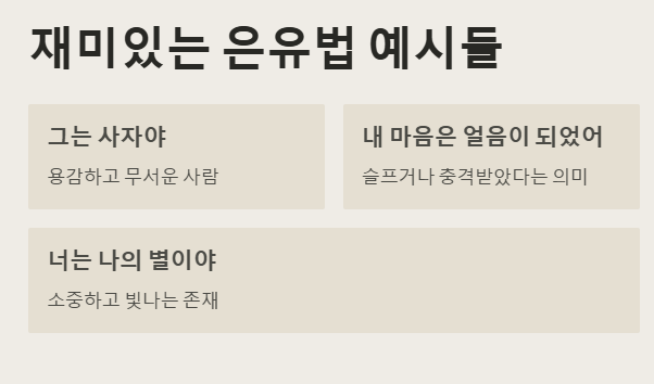다음은 일상에서 자주 들을 수 있는 은유법 표현들이에요. 이런 말들을 들으면 진짜 그런 건 아니어도 어떤 느낌인지 확 오죠?