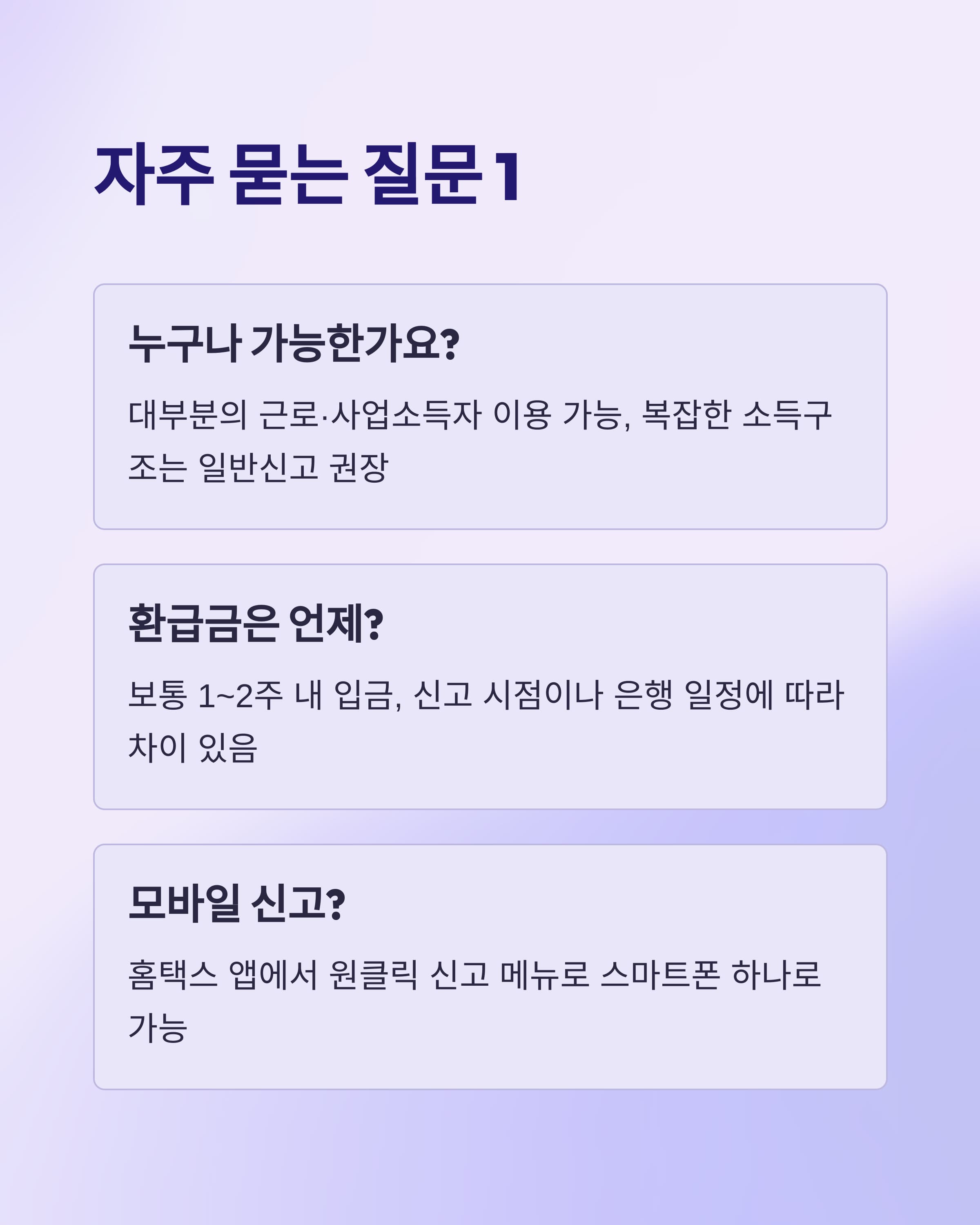 대부분의 근로·사업소득자가 이용 가능해요. 단, 복잡한 소득구조를 가진 분은 일반신고를 권장해요.