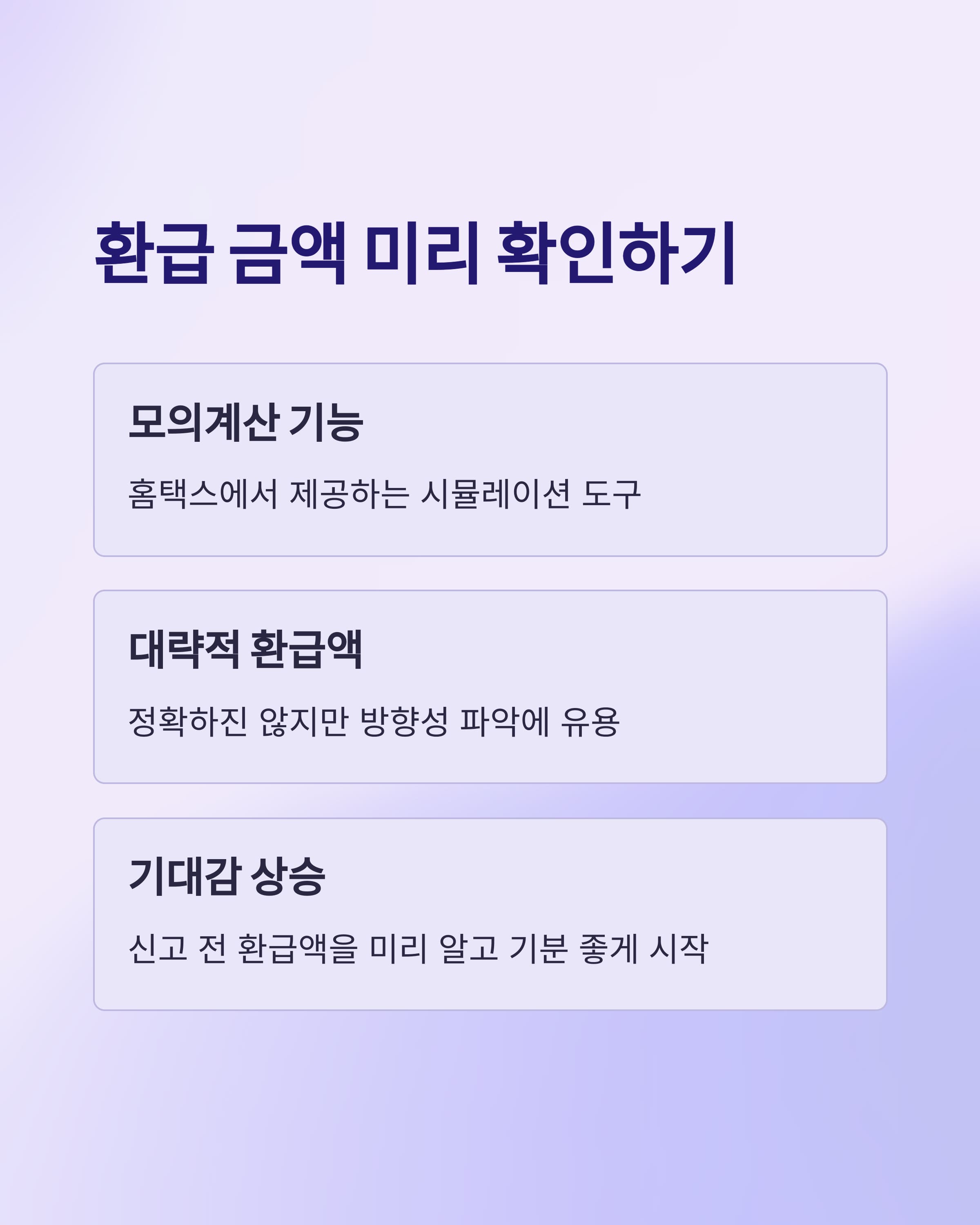 혹시 이번엔 얼마나 돌려받을 수 있을까? 궁금하신가요? 홈택스에서는 모의계산 기능으로 대략적인 환급액을 미리 확인할 수 있어요. 정확하진 않지만, 신고 전에 방향을 잡는 데 꽤 유용해요. 저도 작년엔 이걸로 시뮬레이션 해봤다가 오잉! 생각보다 많이 나오는데? 하고 신고 전부터 기대감 뿜뿜했거든요!