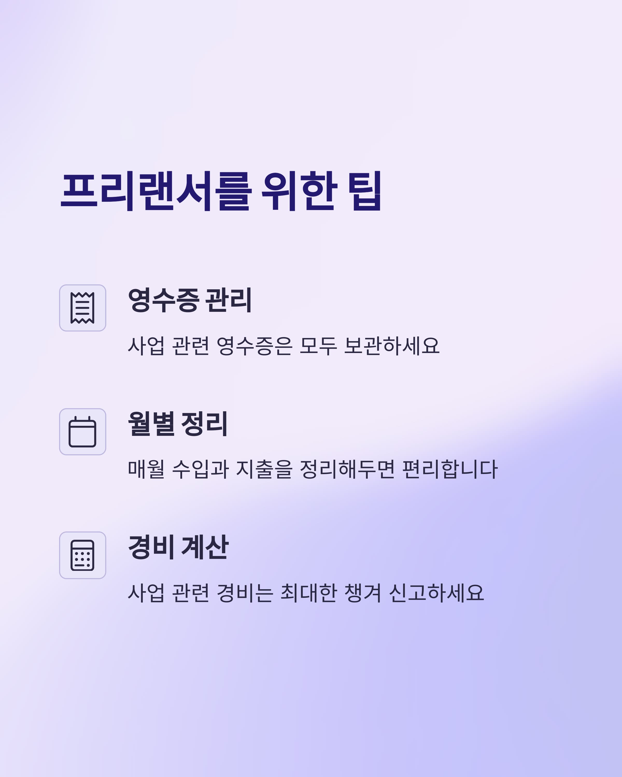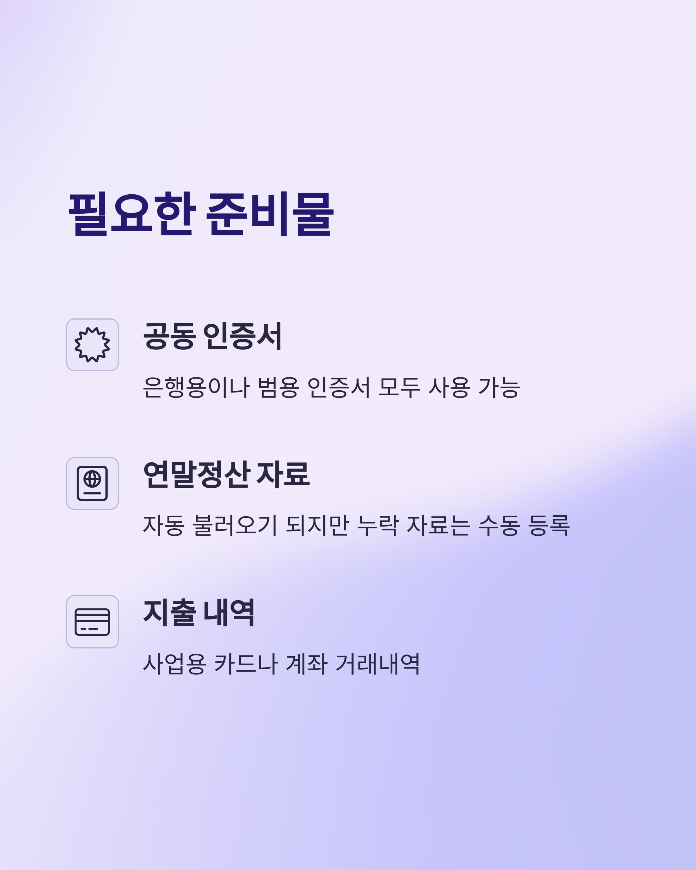 | 지출 내역 | 사업용 카드나 계좌 거래내역이 있다면 환급에 유리해요. |
