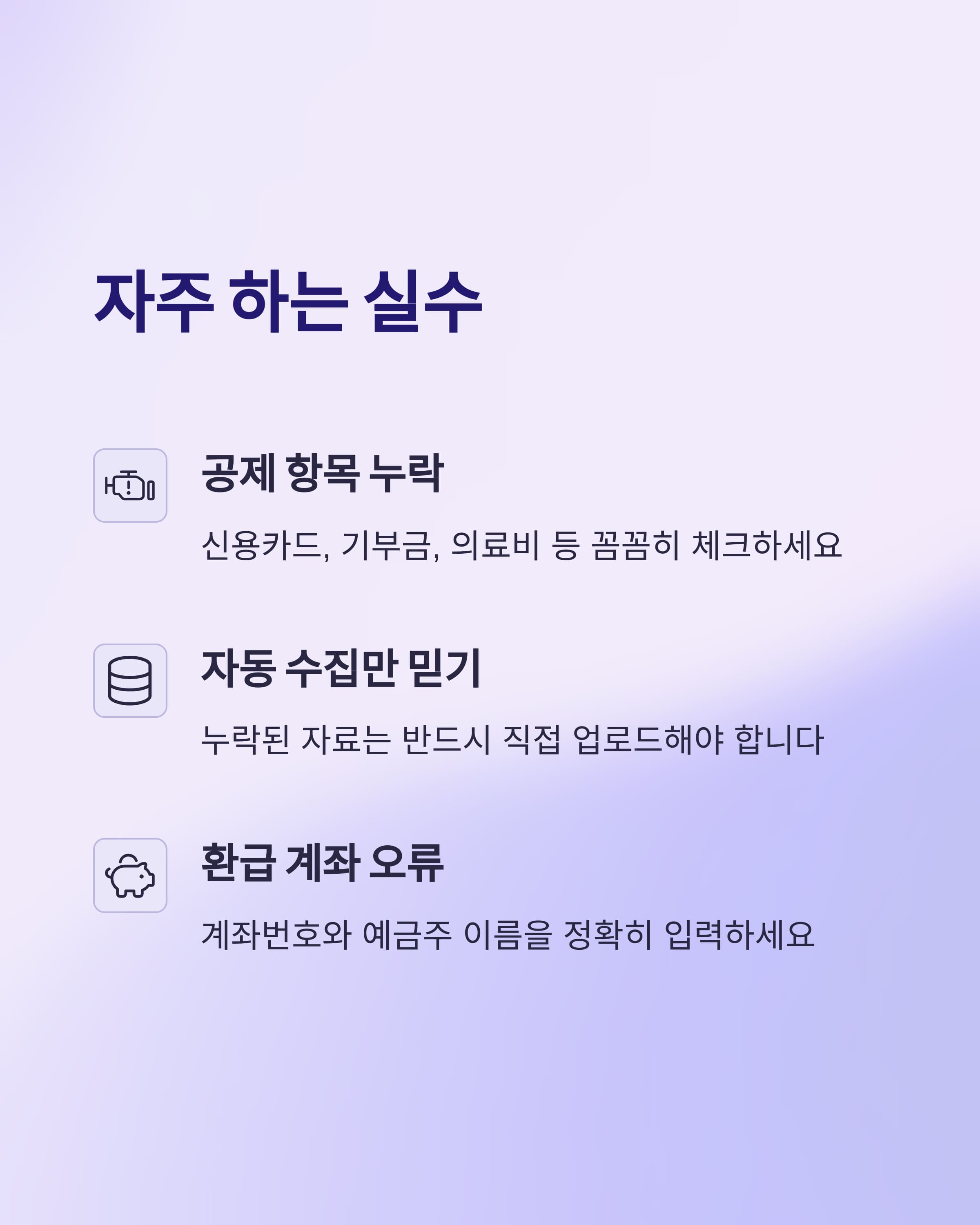 | 공제 항목 누락 | 신용카드, 기부금, 의료비 등 꼼꼼히 체크! |