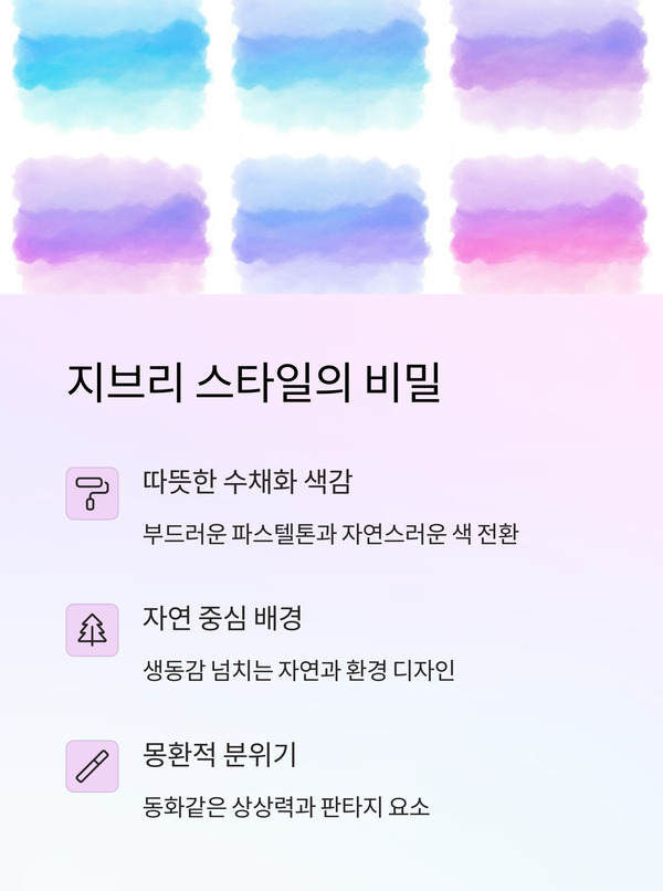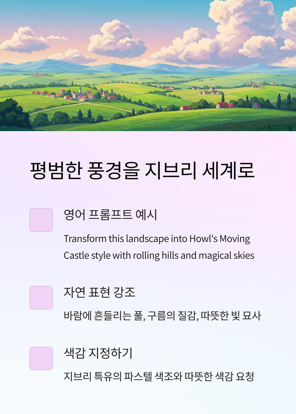 아래는 AI 이미지 생성 툴에서 실제로 사용해볼 수 있는 지브리풍 프롬프트 문장 예시예요.