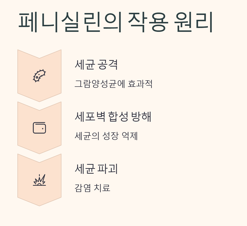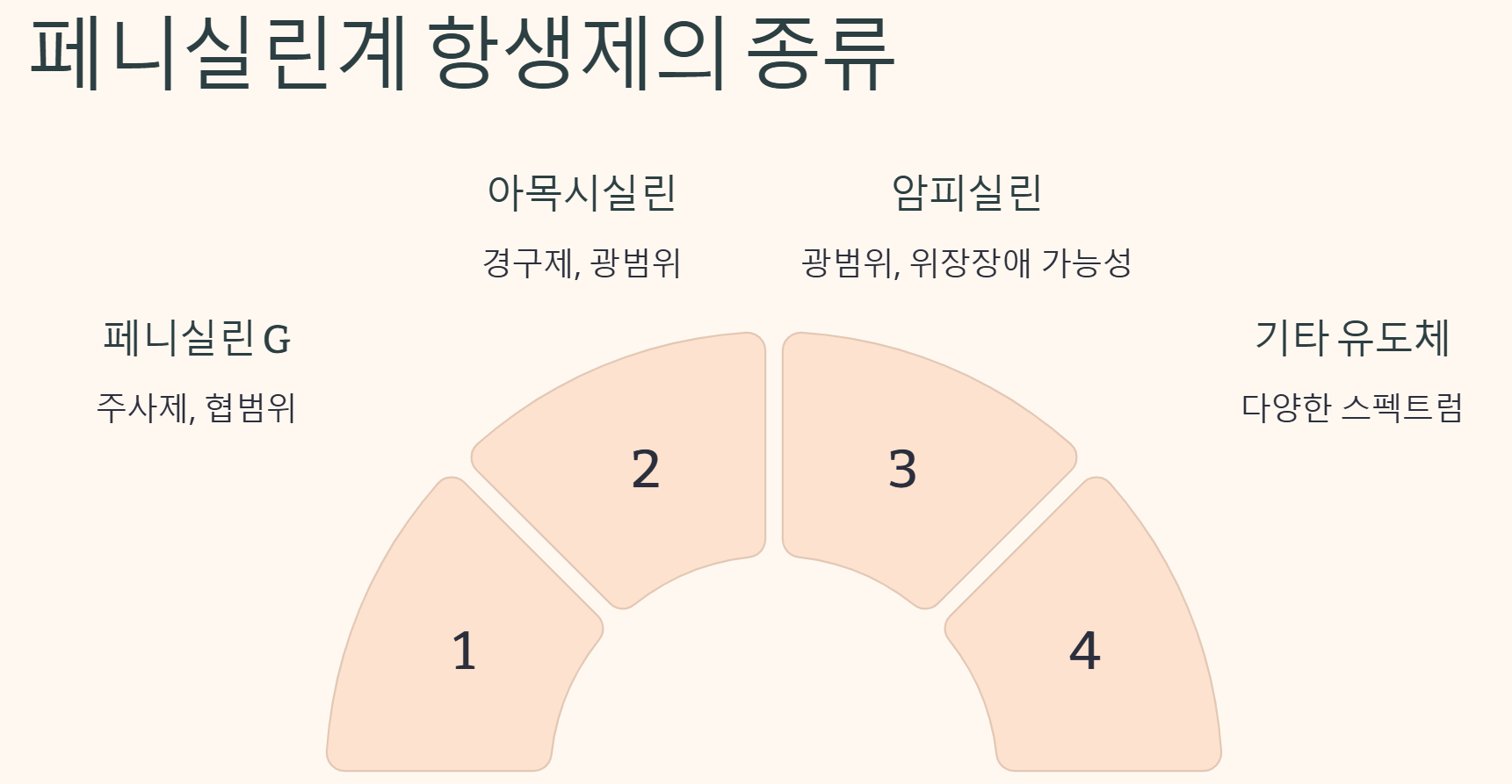 페니실린은 세균의 세포벽 합성을 방해하여 박멸하는 작용을 하며, 주로 그람양성균에 효과적입니다. 이후 개량을 거쳐 다양한 스펙트럼을 가진 패니실린 유도체들이 개발되었고, 현재까지도 감염 치료의 1차 선택약으로 널리 사용되고 있어요. 아목시실린, 암피실린, 페니실린G 등이 대표적인 예입니다.
