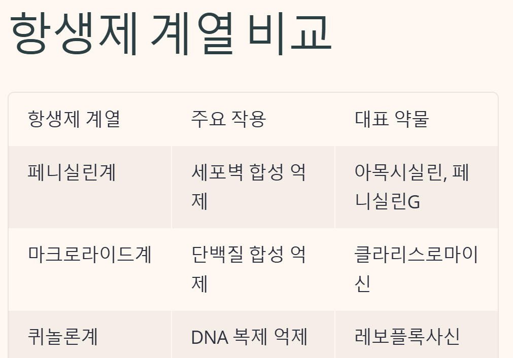 | 항생제 계열 | 주요 작용 | 대표 약물 |