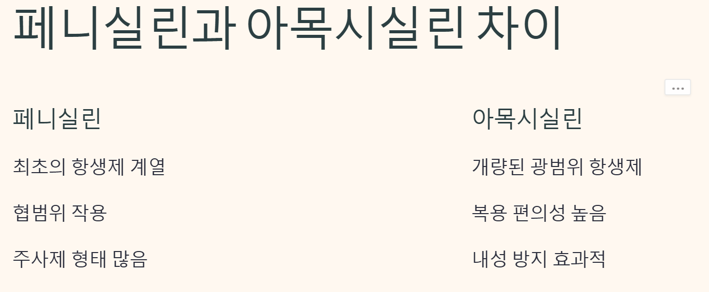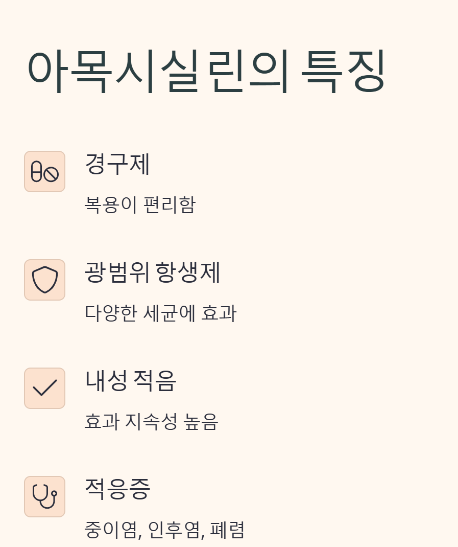 | 아목시실린 | 경구제, 광범위, 내성 적음 | 중이염, 인후염, 폐렴 등 |
