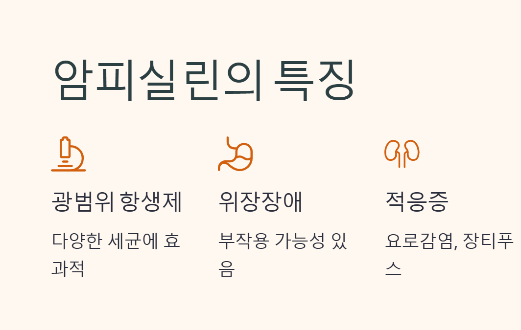 | 암피실린 | 광범위, 위장장애 가능성 있음 | 요로감염, 장티푸스 |