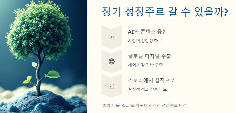 이제는 스토리를 실적으로 바꾸는 전략이 필요합니다. 실제 콘텐츠 수출 계약, 글로벌 플랫폼 진출 등이 그 열쇠가 될 것입니다.