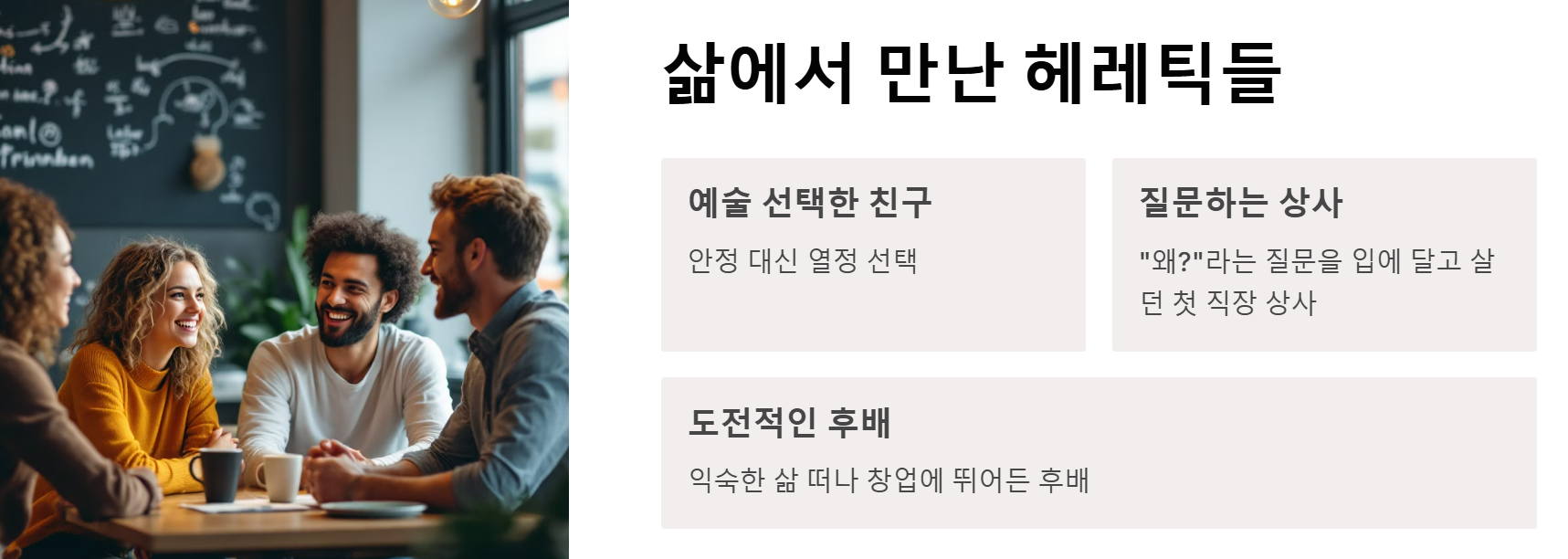 살다 보면 꼭 한 명쯤은 만나요. 틀에 박힌 사고에 갇히지 않고, 누구보다 먼저 질문을 던지고, 다르게 말하고, 다르게 행동하는 사람들 말이죠. 제 삶에서 만난 ‘헤레틱’들도 그랬어요.