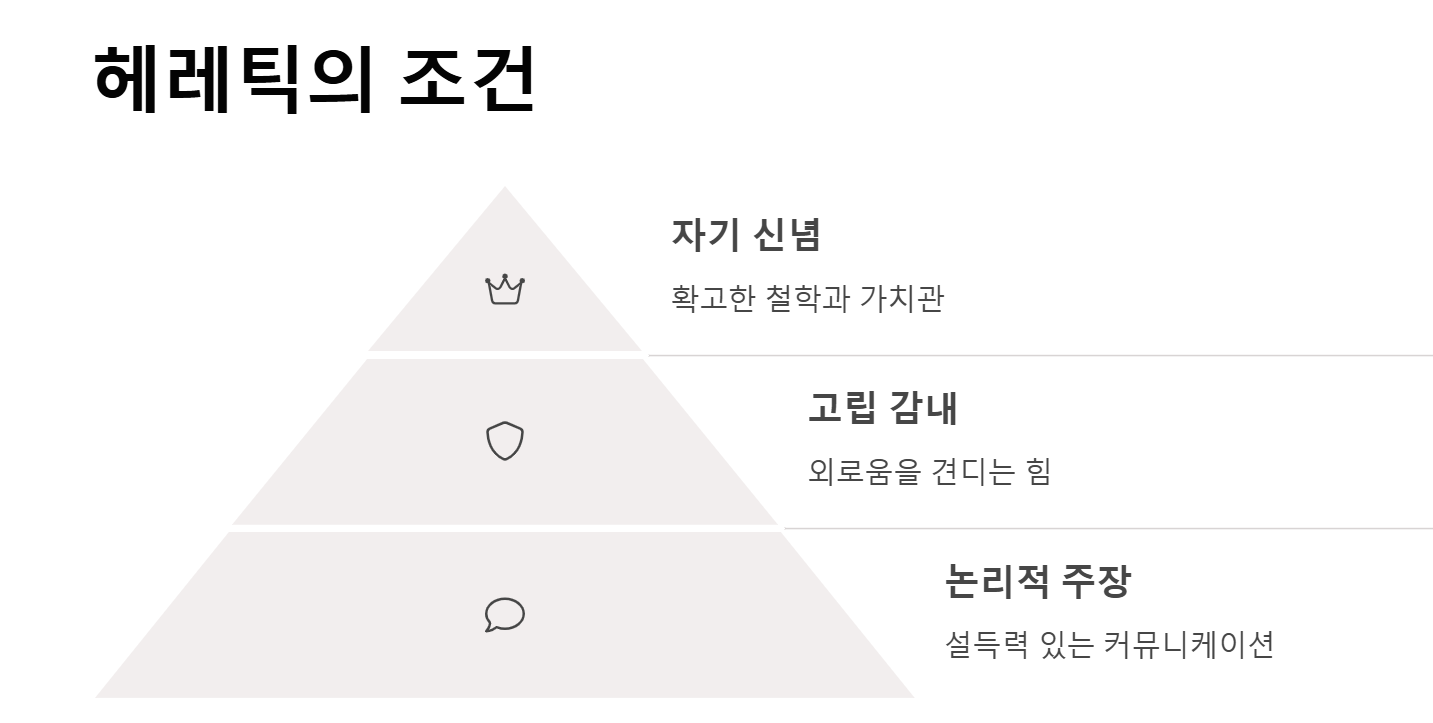 자기 신념을 지키는 용기, 고립을 감내하는 태도, 그리고 논리적인 주장과 철학이 필요하다고 생각해요.