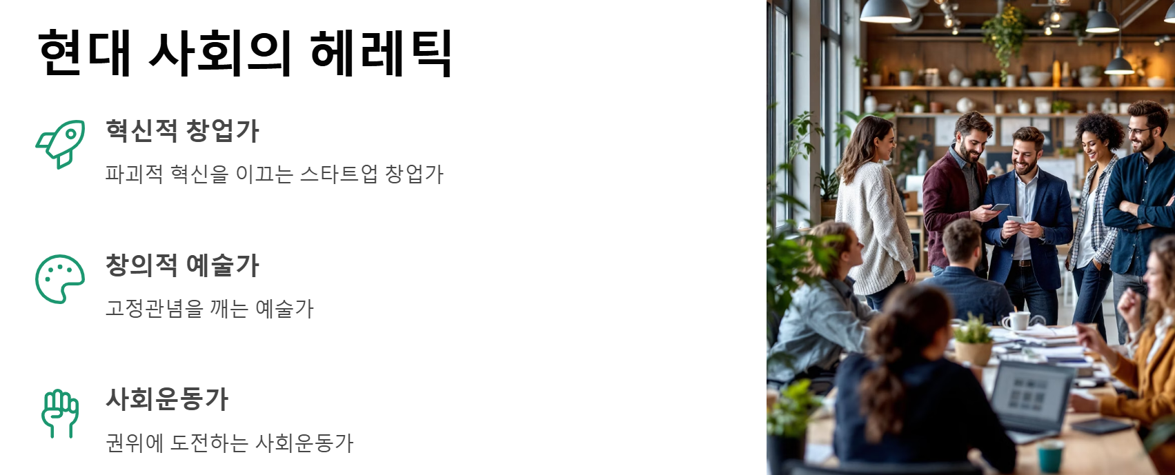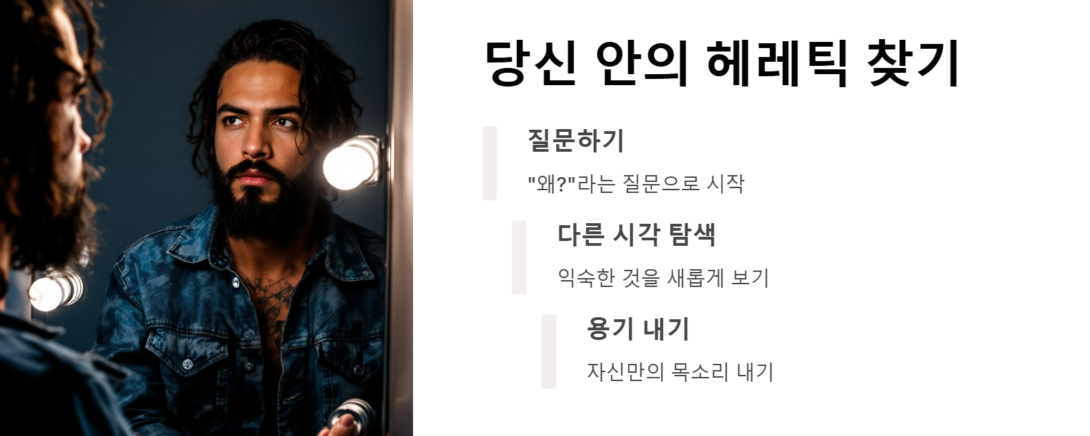 지금 우리 일상에서 '헤레틱'이라는 단어를 들을 일은 거의 없지만, 그 상징성은 여전히 강력합니다. 고정된 틀에서 벗어나 독자적인 시각을 가진 이들—이른바 창조적 반란자들을 우리는 ‘현대의 헤레틱’이라 부를 수 있지 않을까요?