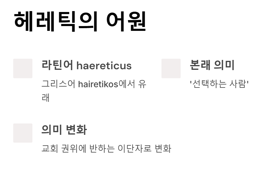 ‘헤레틱(Heretic)’이라는 단어는 원래 라틴어 haereticus에서 유래되었고, 이는 다시 그리스어 hairetikos에서 왔어요. 본래는 ‘선택하는 사람’이라는 뜻이었죠. 하지만 시간이 지나면서 교회의 권위에 반하는 사람, 즉 이단자라는 의미로 굳어졌어요. 결국 '다르게 생각하는 자'를 두고 사람들은 ‘이단’이라는 이름을 붙이며 경계하기 시작한 거죠.