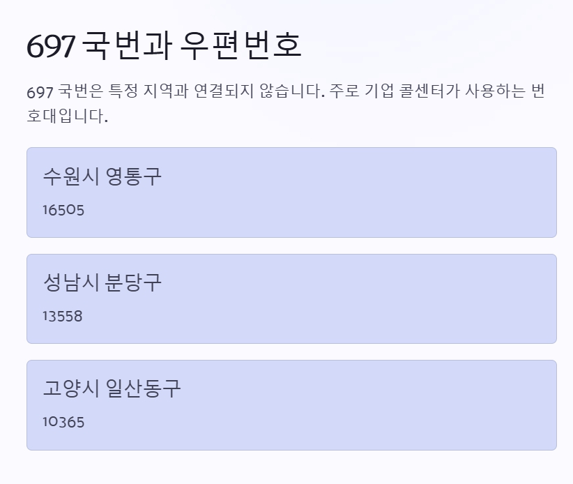 국번 ‘697’은 구체적인 도시나 동네를 특정하는 건 아니에요. 하지만 이런 국번은 보통 기업 콜센터가 사용하는 번호 대역에 해당합니다. 따라서 697과 연결된 정확한 우편번호는 없습니다. 대신, 031 지역번호에 해당하는 대표적인 우편번호 예시를 알려드릴게요.