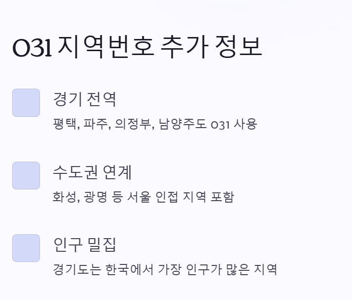 | 평택, 파주, 의정부, 남양주, 화성, 광명 등 경기 전역 | 031 |