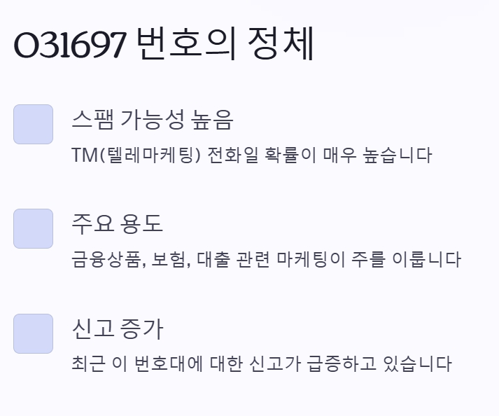 031697 번호는 2023년부터 꾸준히 신고가 접수되고 있는 번호대 중 하나입니다. 한국인터넷진흥원(KISA) 기준으로도 금융상품 권유, 보험 설계 상담, 대출 유도 등 상업적 목적의 콜로 분류되어 있죠. 특히 '697' 국번은 정체불명의 번호로 소비자 불신이 커지는 추세예요.