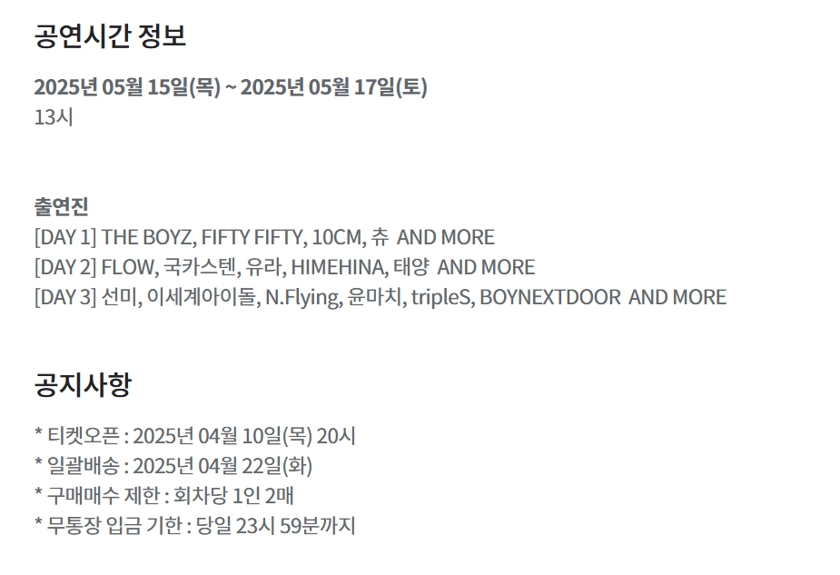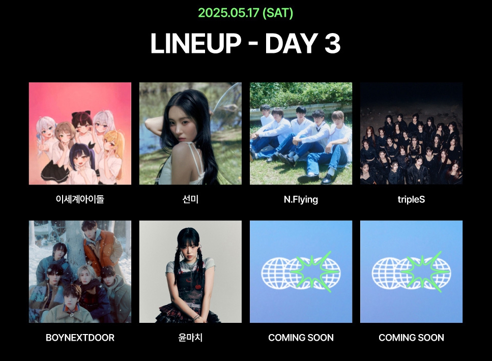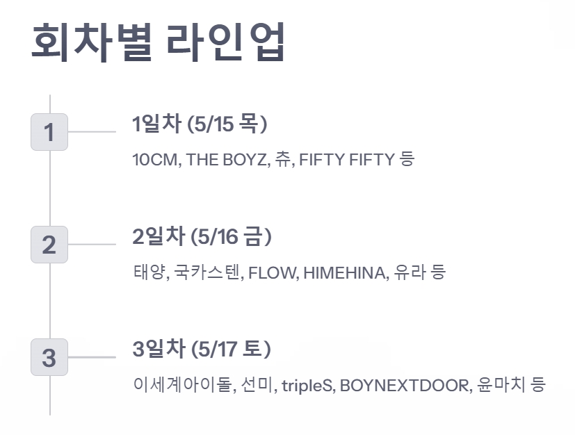 | 3일차 | 5/17 (토) | 이세계아이돌, 선미, tripleS, BOYNEXTDOOR, 윤마치 등 |