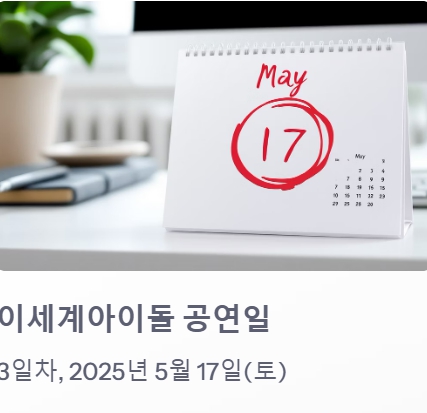 이세계아이돌은 3일차, 2025년 5월 17일(토) 무대에 출연합니다. 해당 날짜 티켓을 예매하셔야 합니다.