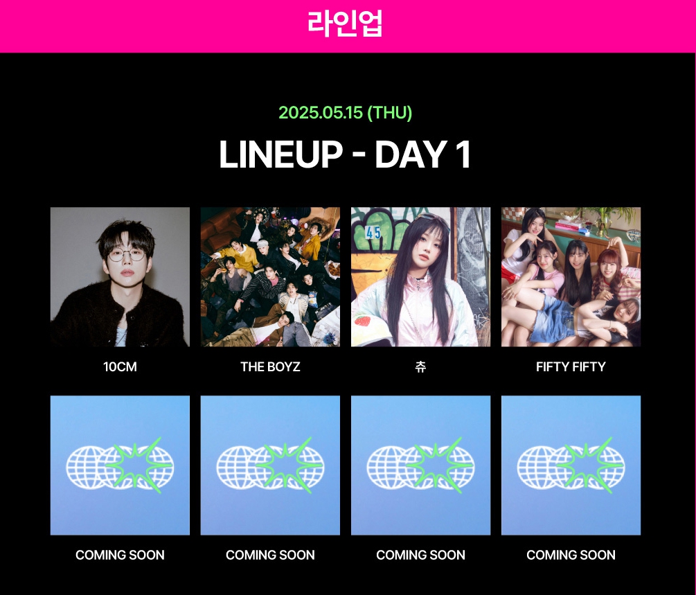 | 1일차 | 5/15 (목) | 10CM, THE BOYZ, 츄, FIFTY FIFTY 등 |