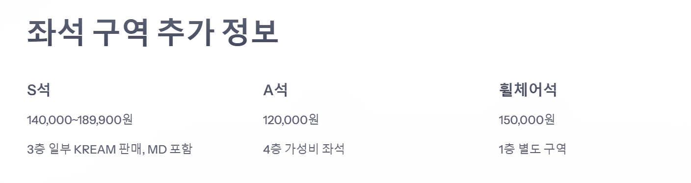 - S석 - 140,000~189,900원 / 3층 일부 KREAM 판매, MD 포함