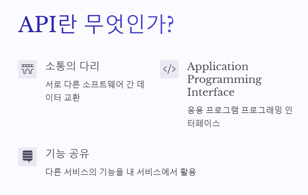 API는 Application Programming Interface의 약자로, '응용 프로그램 프로그래밍 인터페이스'라고 해석할 수 있어요. 쉽게 말해, 서로 다른 소프트웨어 간에 데이터를 주고받거나 기능을 사용할 수 있게 도와주는 소통의 다리 같은 존재예요. 예를 들면, 여러분이 앱에서 로그인할 때 "카카오로 로그인" 버튼 누르면 카카오 서버랑 통신해서 내 정보를 가져오잖아요? 그게 다 API 덕분이에요.