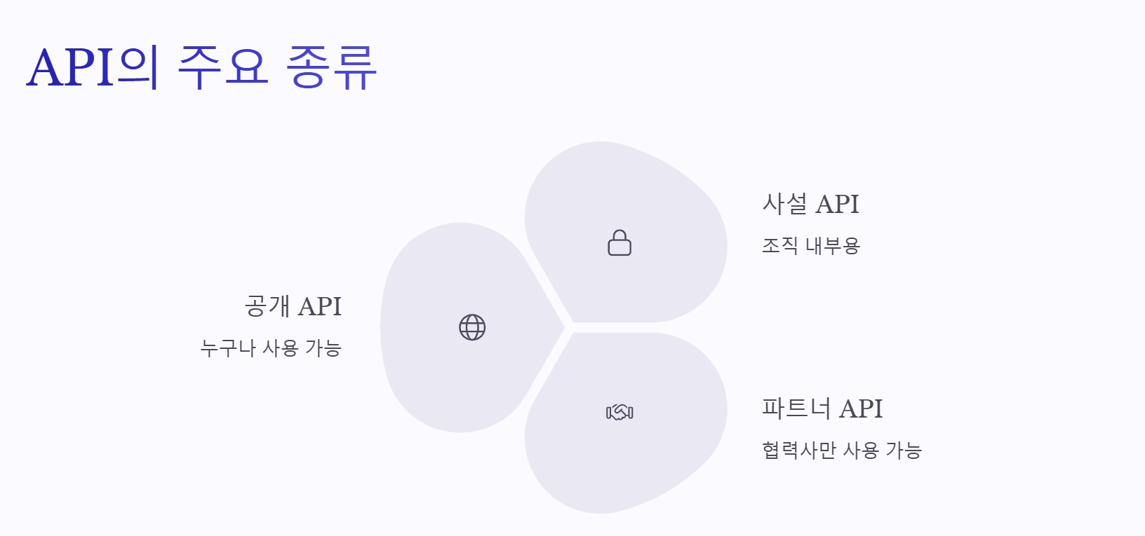 API도 쓰임새에 따라 종류가 나뉘어요. 어떤 API는 모두에게 열려 있고, 어떤 건 특정 회사 내부에서만 쓰이기도 하죠. 아래처럼 정리할 수 있어요.