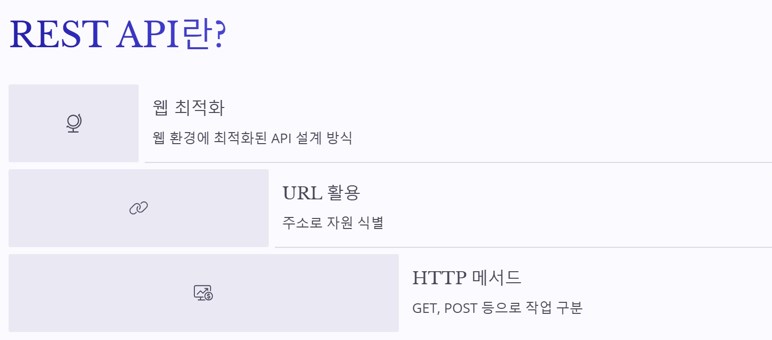 REST는 웹 환경에 최적화된 API 설계 방식이에요. 주소(URL)와 메서드(GET, POST 등)를 조합해서 자원을 다루는 구조죠.