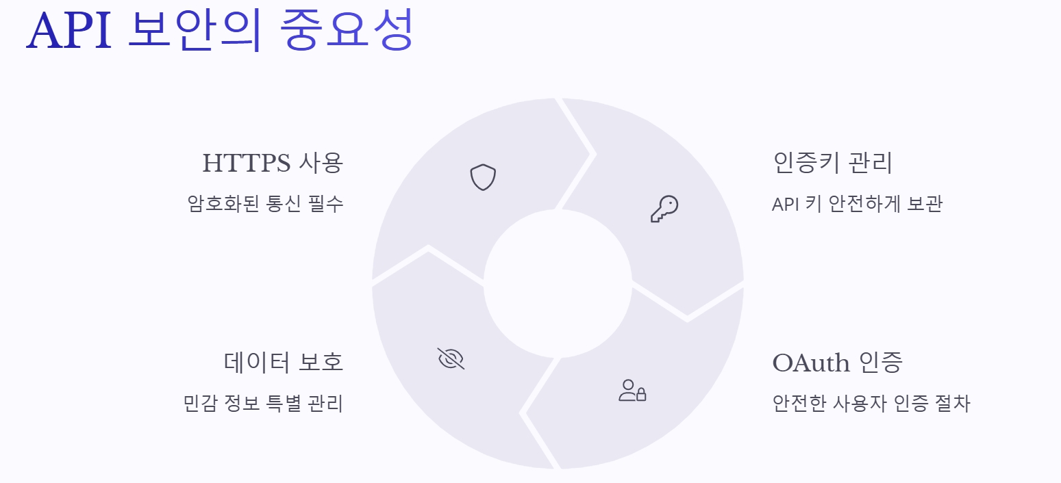 HTTPS 사용, 인증키(token), OAuth 같은 인증 절차를 반드시 적용해야 해요. 민감한 데이터는 특히 주의!