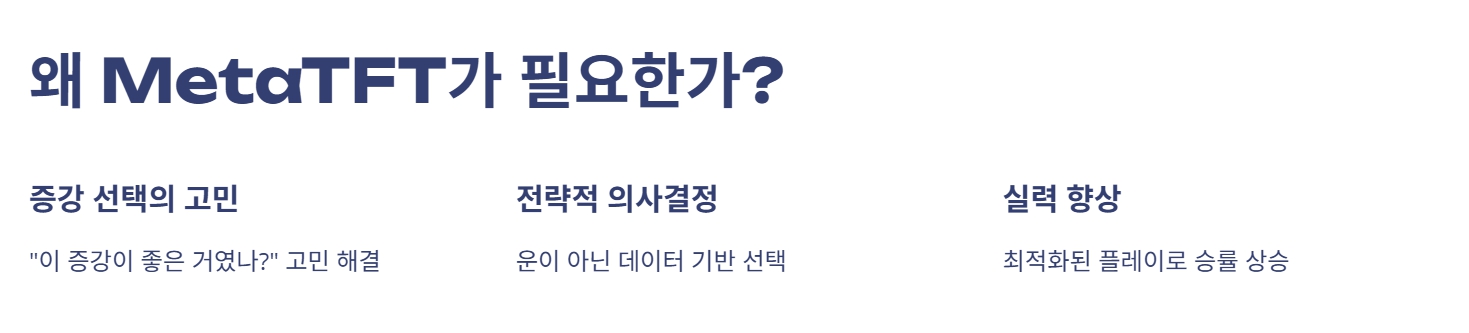 게임을 하면서 "이 증강이 좋은 거였나?" 고민해본 적 있으신가요? MetaTFT라면 그런 걱정은 이제 끝입니다.
