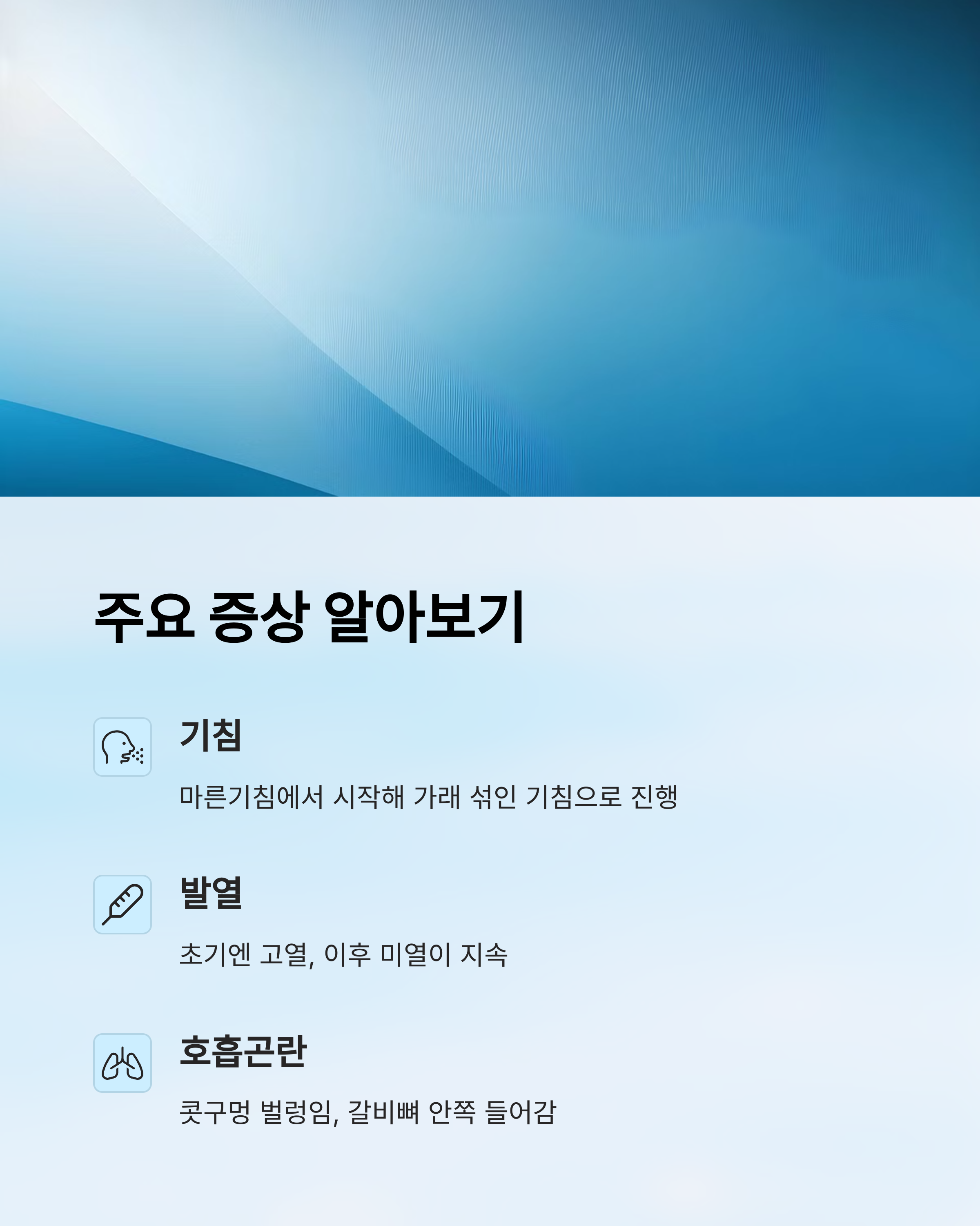 | 기침 | 마른기침에서 시작해 가래 섞인 기침으로 진행됨 |