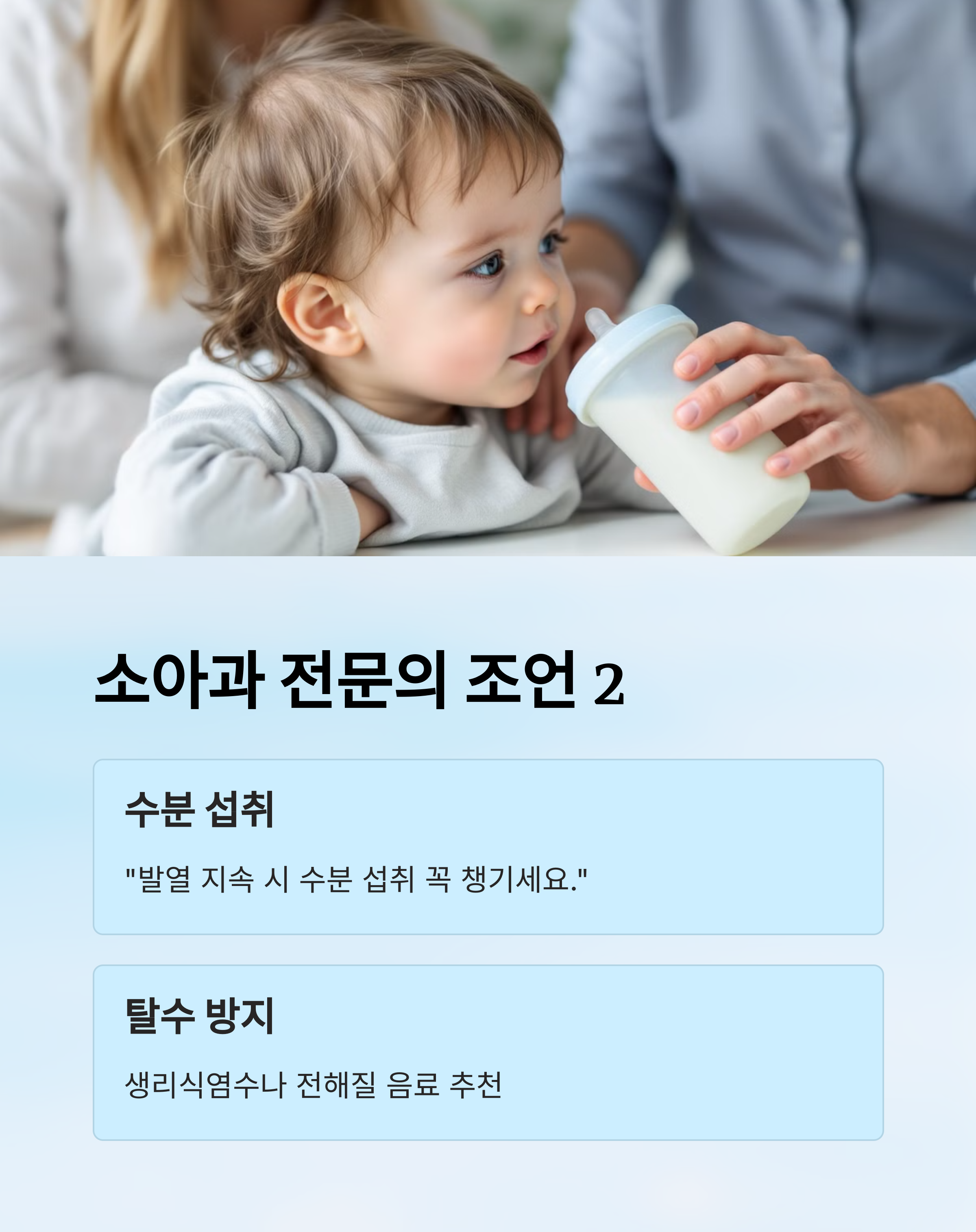 | "발열 지속 시 수분 섭취 꼭 챙기세요." | 탈수 방지 위해 생리식염수나 전해질 음료 추천 |