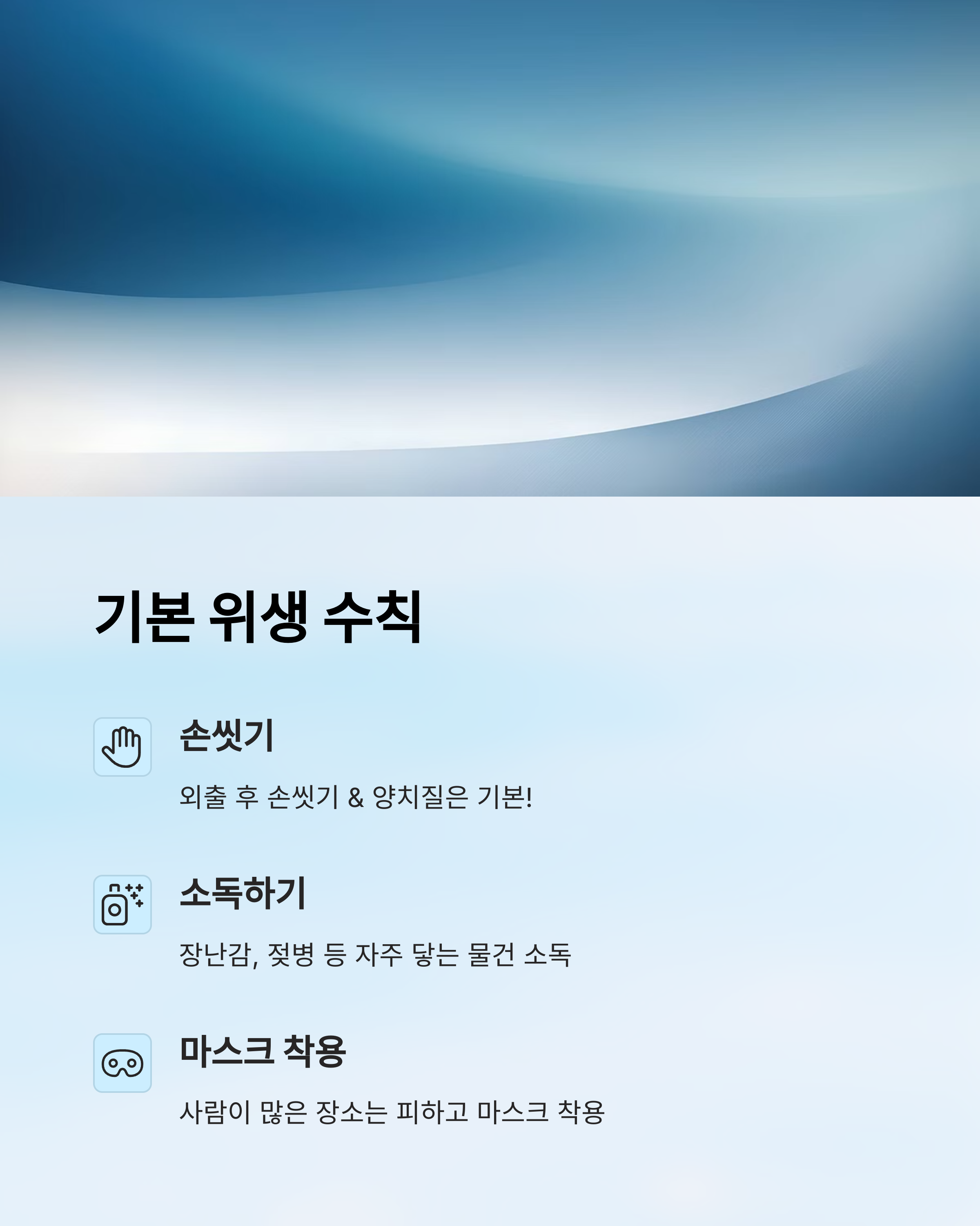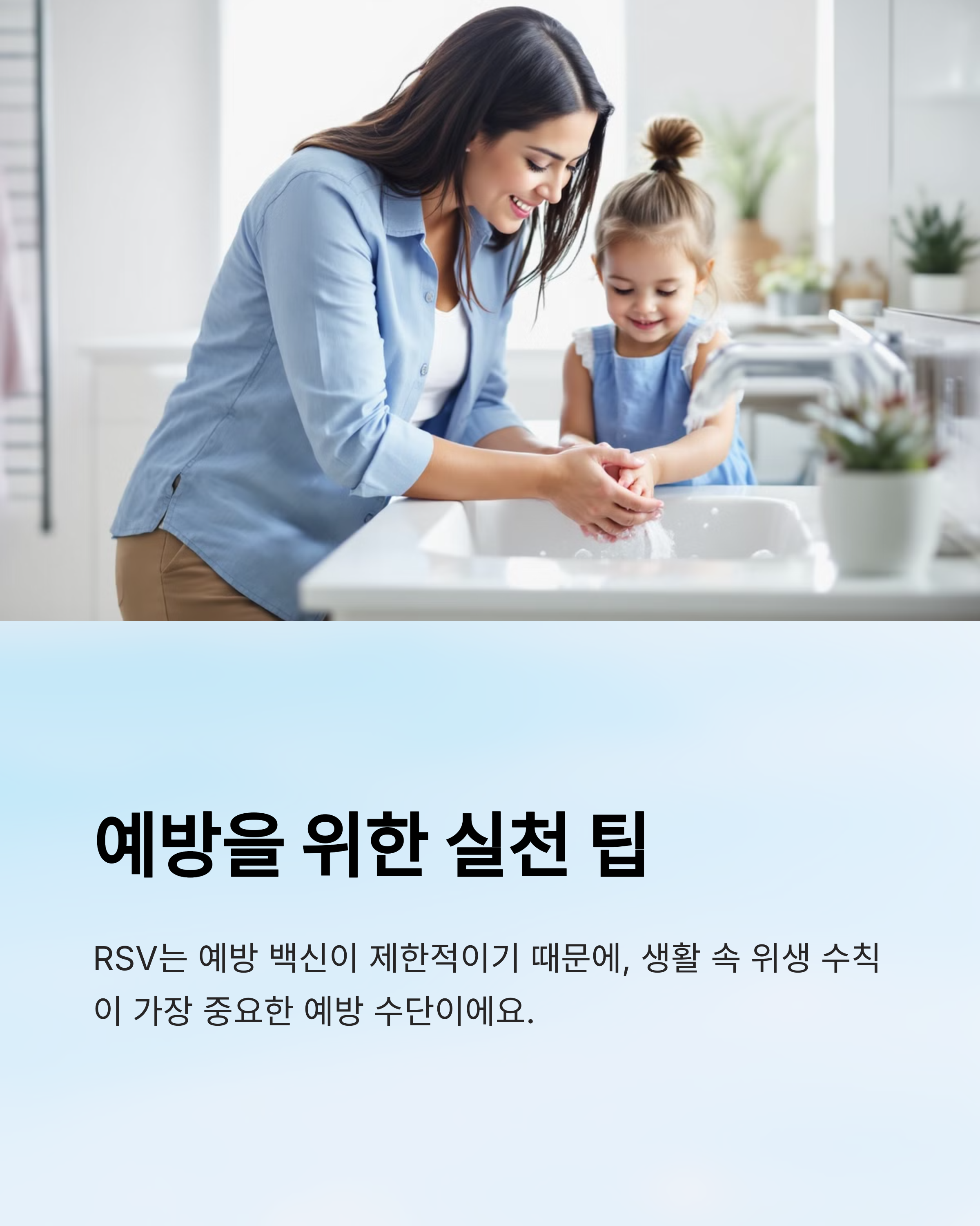 RSV는 예방 백신이 제한적이기 때문에, 생활 속 위생 수칙이 가장 중요한 예방 수단이에요. 특히 어린 자녀가 있는 가정에서는 평소 실천이 꼭 필요하답니다.
