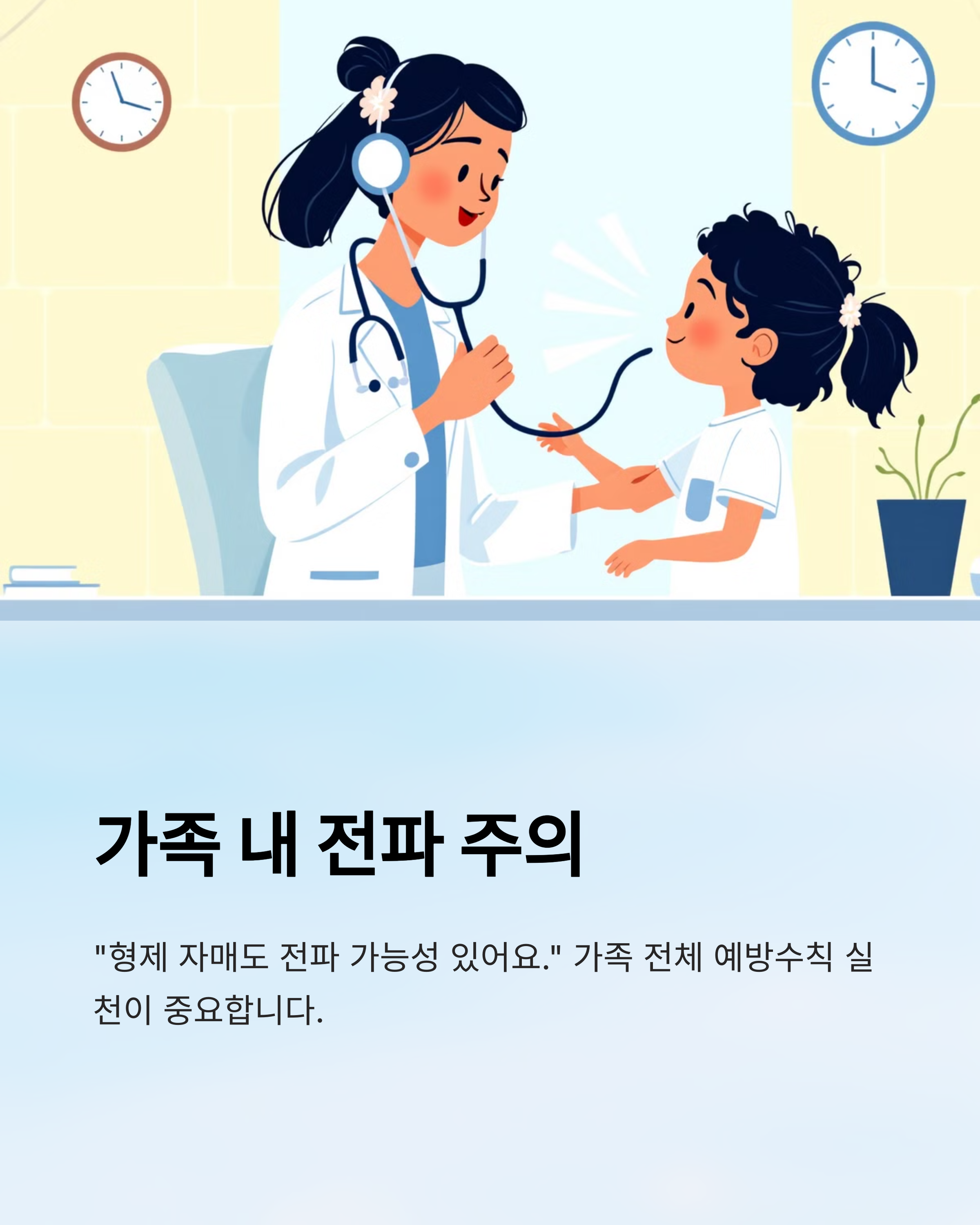 | "형제 자매도 전파 가능성 있어요." | 가족 전체 예방수칙 실천이 중요 |